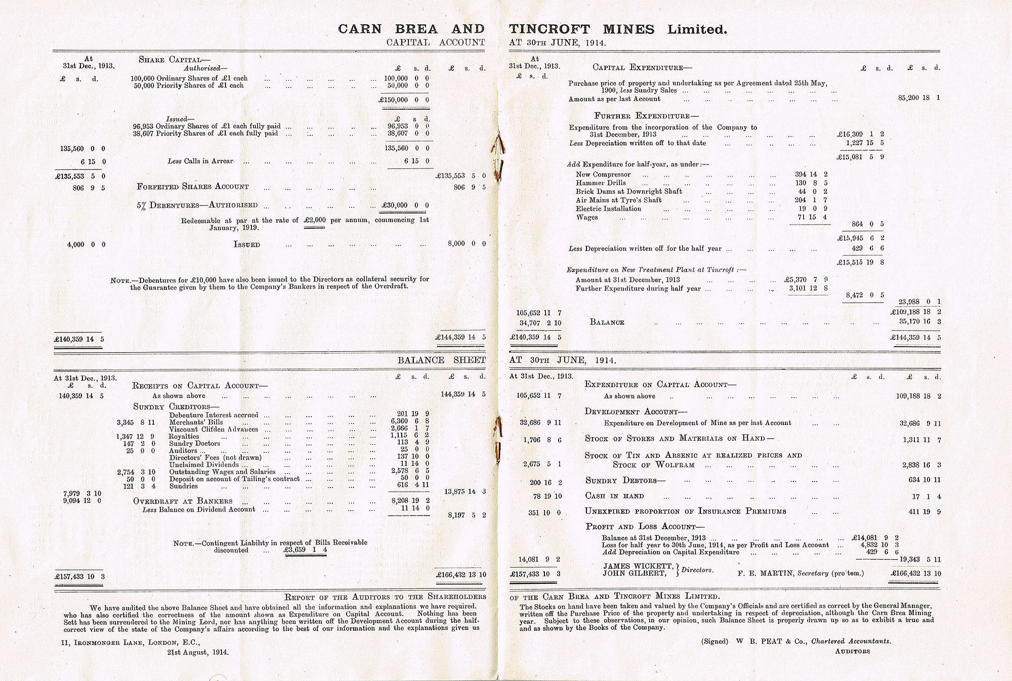 Next is the General Manager’s Report to the 30th June 1914. It is interesting to note on the Chairman’s Report page 3 it is reported that the Carn Brea Section had been relinquishe. Meanwhile work will be concentrated on the Tincroft Sections of the Mine.